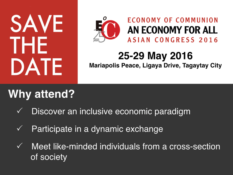 Save the Date of the EoC Asian Congress: "Economy of Communion: An Economy for all"- May 25-29, 2016, at the Mariapolis Peace, Tagaytay City, Philippines