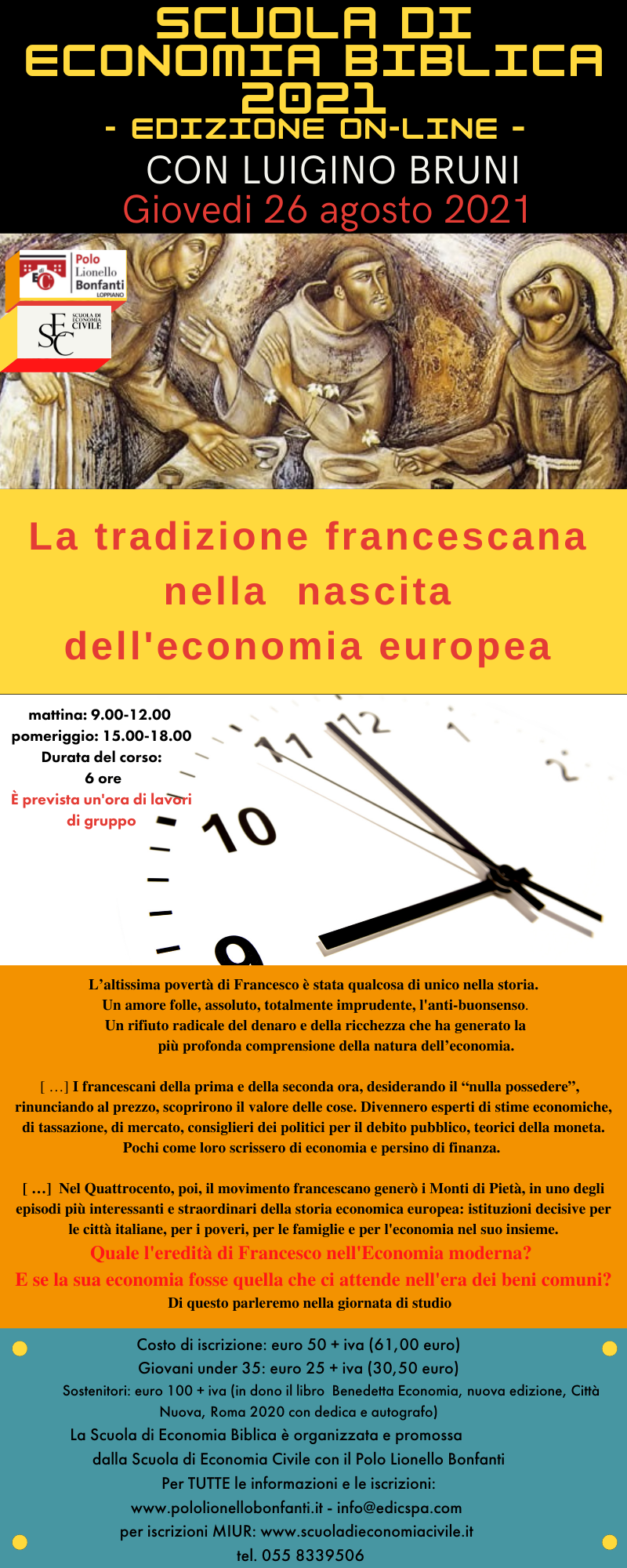 La Scuola di Economia Biblica è lieta di presentare il suo secondo corso -interamente online- del 2021 in programma per il week end del 13 e 14 marzo 2021, a partire dal libro di Luigino Bruni per Dehoniane: "Una casa senza idoli" Una rilettura del libro del Qoèlet - Iscrizioni online qui: https://docs.google.com/forms/d/1-gSrvo3JaZAKonE5cv0-dhhyBaknqasRbN6xuhPbhXo/viewform?gxids=7628&edit_requested=true
