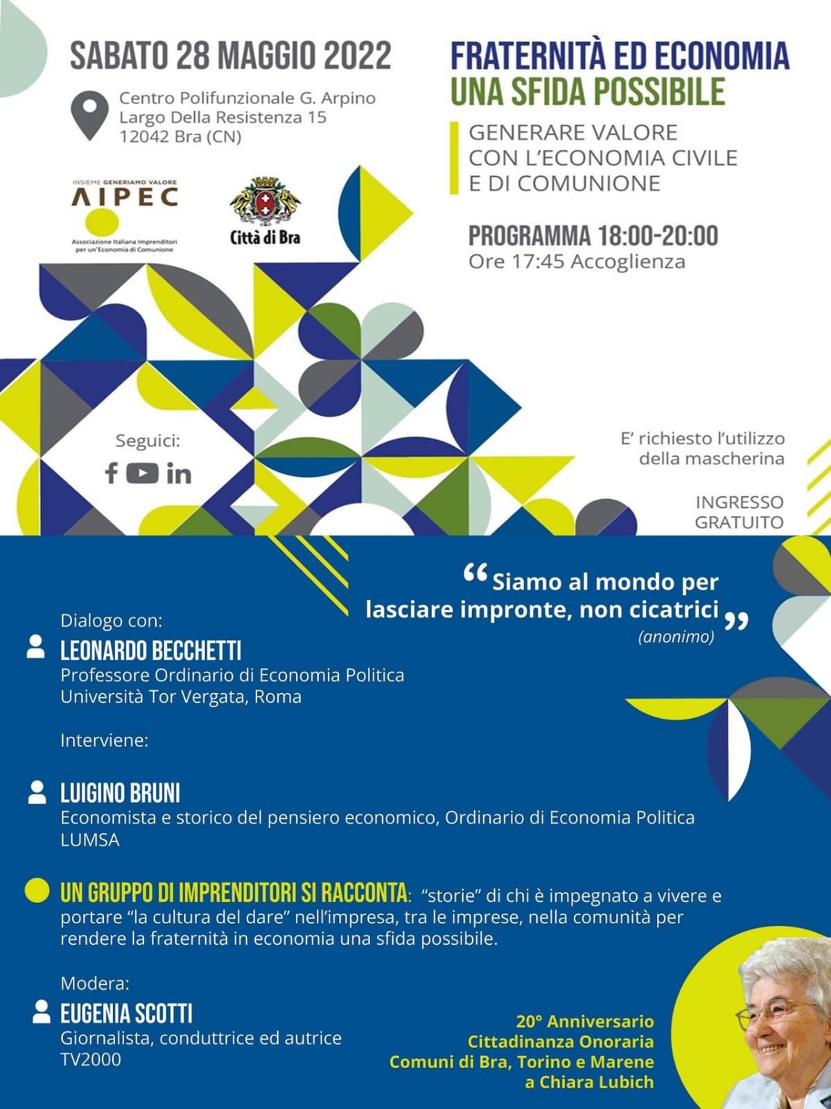 Sabato 28 maggio 2022 – ore 17,45 / 20 a BRA (CN) presso il Centro Polifunzionale G. Arpino - Largo della Resistenza, 15, evento dal titolo: Fraternità ed Economia - Una sfida possibile. Generare valore con l'Economia Civile e di Comunione