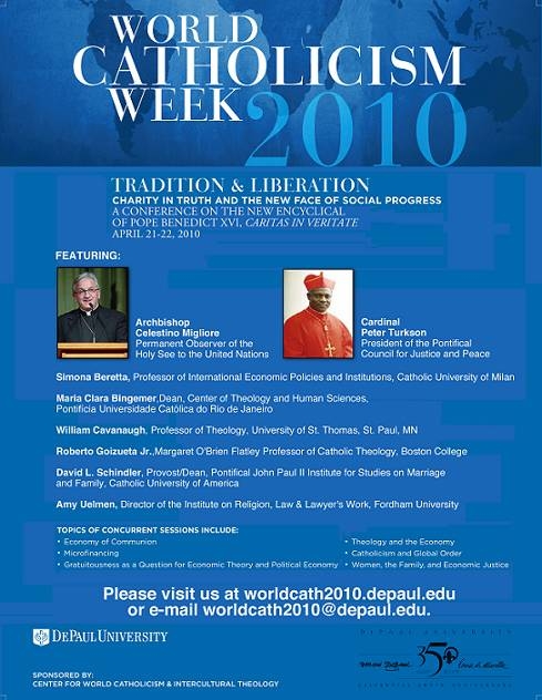 Locandina della Conferenza alla De Paul University sulla nuova enciclica di Papa Benedetto XVI in occasione della "World catholicism week 2010" - Tradizione e Liberazione Caritas in veritate e il nuovo volto del progresso sociale