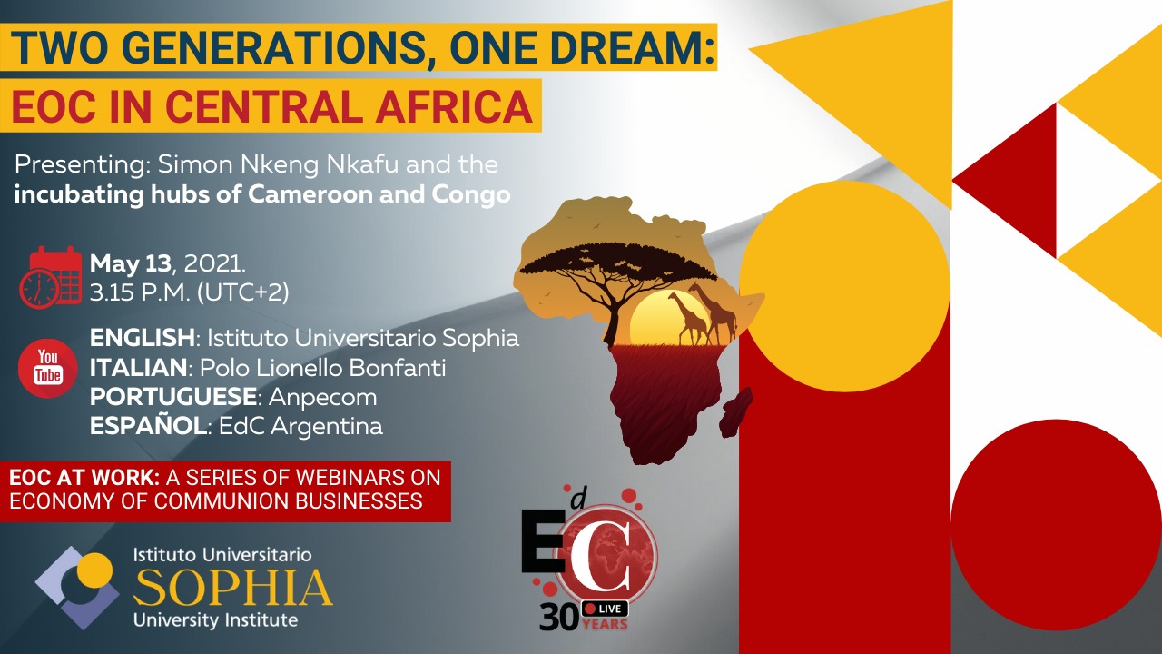 L'Istituto Universitario Sophia ed Economia di Comunione presentano gli "EoC at work: a series of webinars on Economy of Communion Businesses", un webinar al mese fino a maggio, in occasione dei 30 anni dell'Edc, ospite un imprenditore Edc che racconta la propria storia. Il quarto webinar, dal titolo: "Two generations, one dream" avrà come protagonista Simon Nkeng Nkafu (Yaoundé) e gli hub incubatori EoC-iin del Camerun e del Congo - 13 maggio 2021, ore 15:15. Si potrà seguire il webinar in inglese (sul canale youtube dell'Istituto Universitario Sophia) ed in italiano (canale youtube del Polo Lionello Bonfanti, in portoghese (canale youtube Anpecom) ed in spagnolo (canale youtube EdC Argentina)