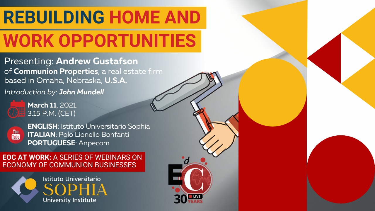 L'Istituto Universitario Sophia ed Economia di Comunione presentano gli "EoC at work: a series of webinars on Economy of Communion Businesses", un webinar al mese da qui a maggio, in occasione dei 30 anni dell'Edc, ospite un imprenditore Edc che racconta la propria storia. Il secondo webinar avrà come protagonista Andrew Gustafson di Communion Properties, Omaha, Nebraska (USA) - 11 marzo 2021, ore 15:00. Si potrà seguire il webinar in inglese (sul canale youtube dell'Istituto Universitario Sophia) ed in italiano (canale youtube del Polo Lionello Bonfanti, qui il link: https://www.youtube.com/watch?v=PGpJf_LzcOE)