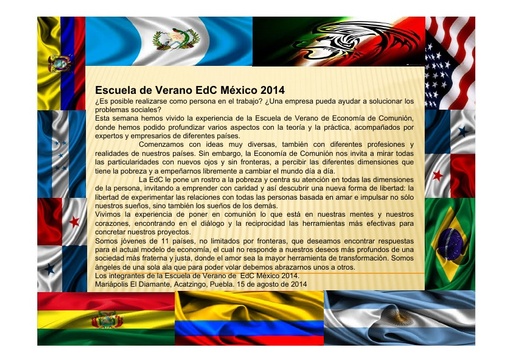 Messaggio dei giovani che hanno partecipato alla Summer School Edc Mexico 2014 - Cittadella El Diamante, Acatzingo, Puebla. 15 agosto 2014
