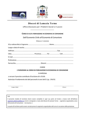 Modulo di iscrizione al corso di Alta Formazione a Economia di comunione della diocesi di Lamezia Terme - dicembre 2010 - giugno 2011