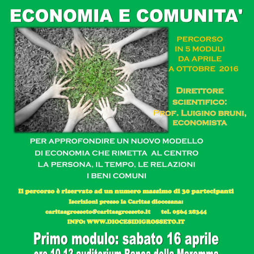 Locandina della Scuola "Economia e Comunità" promossa dalla Diocesi di Grosseto. Primo modulo, 16 aprile 2016