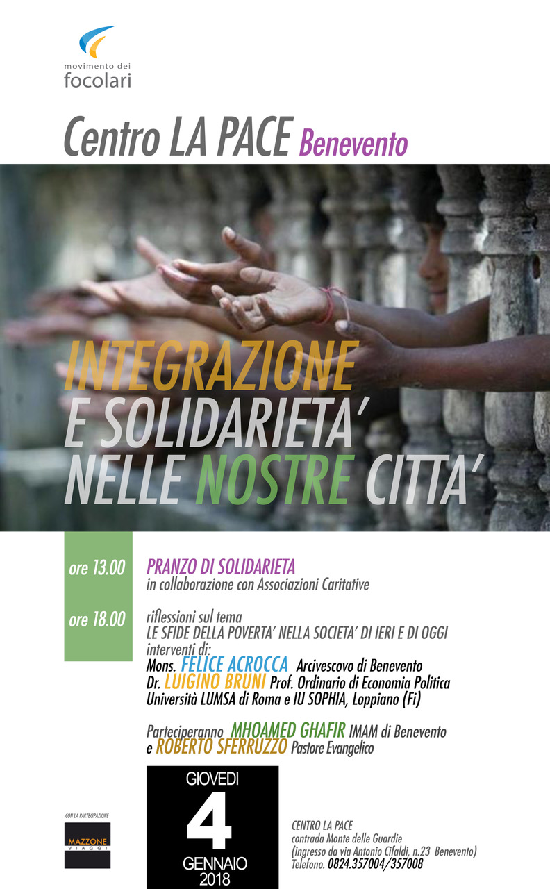 Invito alla Giornata di dialogo e di condivisione organizzata dal Centro La Pace di Benevento, nel cui ambito si svolgerà la serata di riflessione dal titolo: "Le sfide della povertà nella società di oggi", Interviene Luigino Bruni - Benevento, 4 gennaio 2017